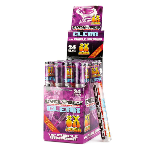 View full detailsPurple Unknown Cyclones Clear Cones. Made from a natural cellulose, water, and glycerin, these cones are transparent. These clear cones burn much s...